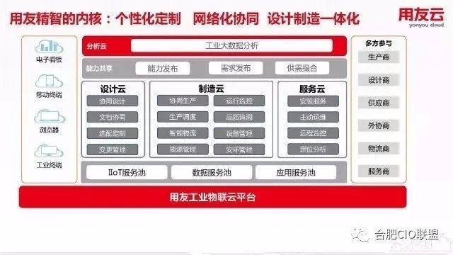 用友希望通过这个平台,帮助制造企业实行敏经营、简IT、易金融。平台核心是通过个性化定制、网络化协同和设计制造一体化,真正满足企业的需求。除了工业云平台之外,用友也提供一些行业云,包括建筑云、政务云等等,也会提供其行业的应用。