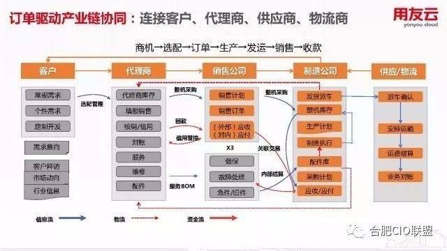 中国龙工在国内机器行业排名第五,有三大生产基地,五个销售公司,还有14个生产制造企业。在2016年的那种大环境下,还能做到利润增加200%,同比增长200%,到底是怎么做到的?其实用友做了一件事,就是订单驱动产业链的协同制造,把它的客户、代理商、供应商、物流商全部拉通起来。