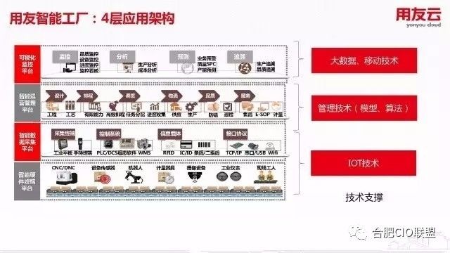 第二个方面,智能工厂四层体系架构。最下面一层是智能硬件的终端采集。第二部分用友智能终端,关键是能把它采集起来,数据抓起来。数据抓起来之后,其实要做运营,做运营的结果最后是可视化的监控和分析,这是运营工厂的架构。