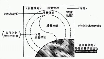 上图中正方形表示全部质量管理工作。要开展质量管理,首先应制定质量方针,同时进行质量策划、设计并建立一个科学有效的质量体系。而要建立质量体系,则应设置质量管理组织机构,明确其职责权限,然后开展质量控制活动和内部质量保证活动。质量控制活动是作业技术和活动,而内部质量保证活动则是为了取得企业领导的信任而开展购活动。二者之间用虚S形分开,这是说明这两种活动是很难明显区分开来的,而大小虚圆则是表示方形内的活动和工作都是质量管理。如用实圆就是把它们与质量管理割开了。