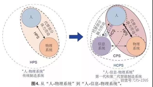 文章指出,传统制造系统包含人和物理系统两大部分,是完全通过人对机器的操作控制去完成各种工作任务,并可抽象描述“人-物理系统”(HPS)。与传统制造系统相比,第一代和第二代智能制造系统发生的本质变化是,在人和物理系统之间增加了信息系统,信息系统可以代替人类完成部分脑力劳动,人的相当部分的感知、分析、决策功能向信息系统复制迁移,进而可以通过信息系统来控制物理系统,以代替人类完成更多的体力劳动,这一转变可用 “人-信息-物理系统”(HCPS)进行描述。