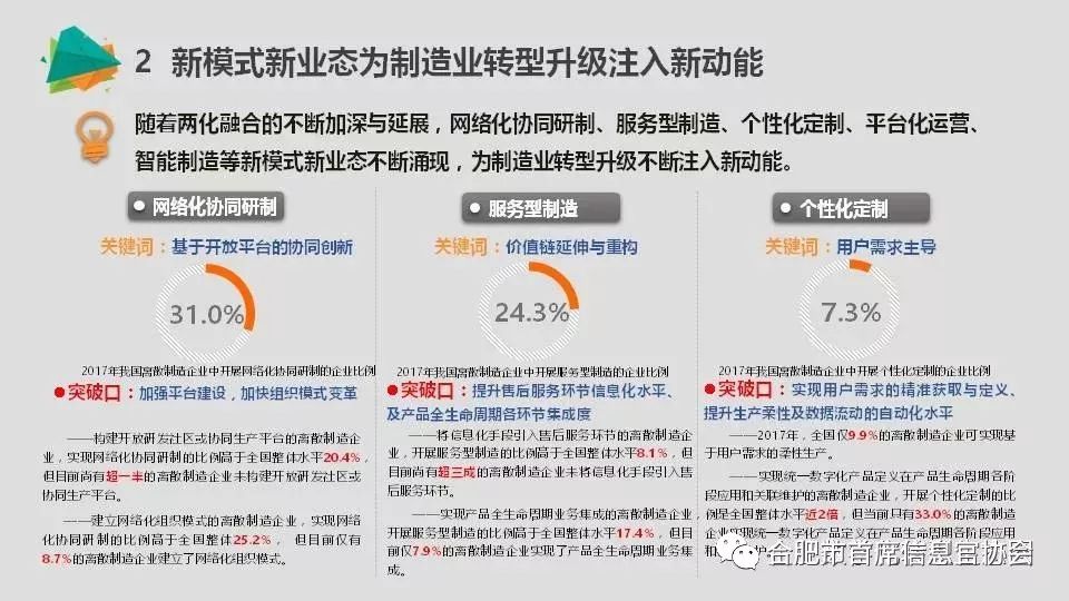 随着两化融合的不断加深与延展,网络化协同研制、服务型制造、个性化定制、平台化运营、智能制造等新模式新业态不断涌现,为制造业转型升级不断注入新动能。
