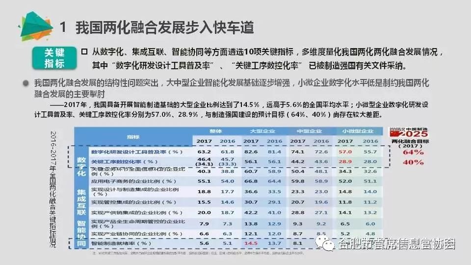 关键指标:从数字化、集成互联、智能协同等方面遴选10项关键指标,多维度量化我国两化两化融合发展情况,其中“数字化研发设计工具普及率” 、“关键工序数控化率” 已被制造强国有关文件采纳;