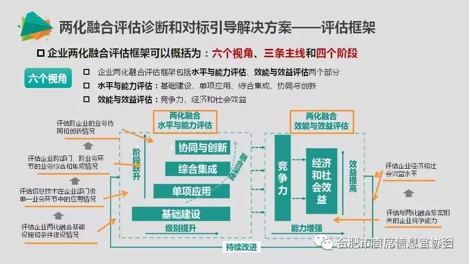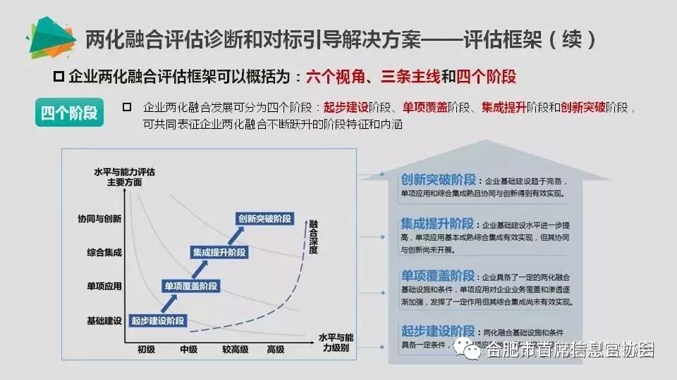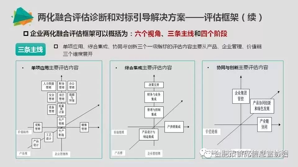 企业两化融合评估框架可以概括为:六个视角、三条主线和四个阶段。