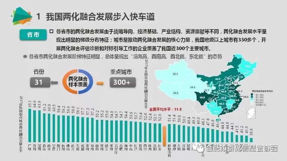 省市: 各省市两化融合发展阶梯特征明显,总体呈现出“沿海高、西南高、西北低、东北低”的态势;