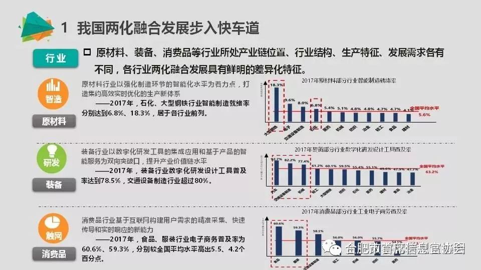行业:原材料、装备、消费品等行业所处产业链位置、行业结构、生产特征、发展需求各有不同,各行业两化融合发展具有鲜明的差异化特征;