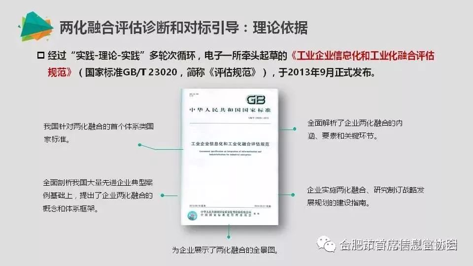 经过“实践-理论-实践”多轮次循环,起草《工业企业信息化和工业化融合评估规范》(国家标准GB/T 23020,简称《评估规范》),于2013年9月正式发布。