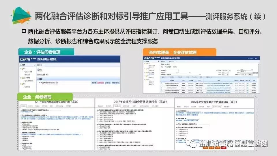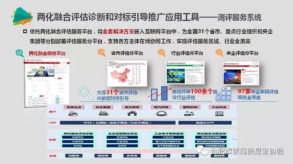 依托两化融合评估服务平台,将全套解决方案嵌入互联网平台中,为全国31个省市、重点行业组织和央企集团等分别部署评估服务分平台,支持各方主体在线协同工作,实现评估服务区域、行业全覆盖。