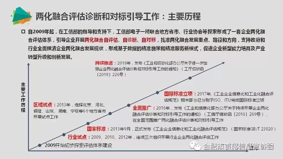 自2009年起,在工信部的指导和支持下,工信部电子一所联合地方省市、行业协会等探索形成了一套企业两化融合评估体系,引导企业开展两化融合自评估、自诊断、自对标,经历了区域试点、行业试点、国家标准、全面推广、国际标准立项、持续推进等历程。