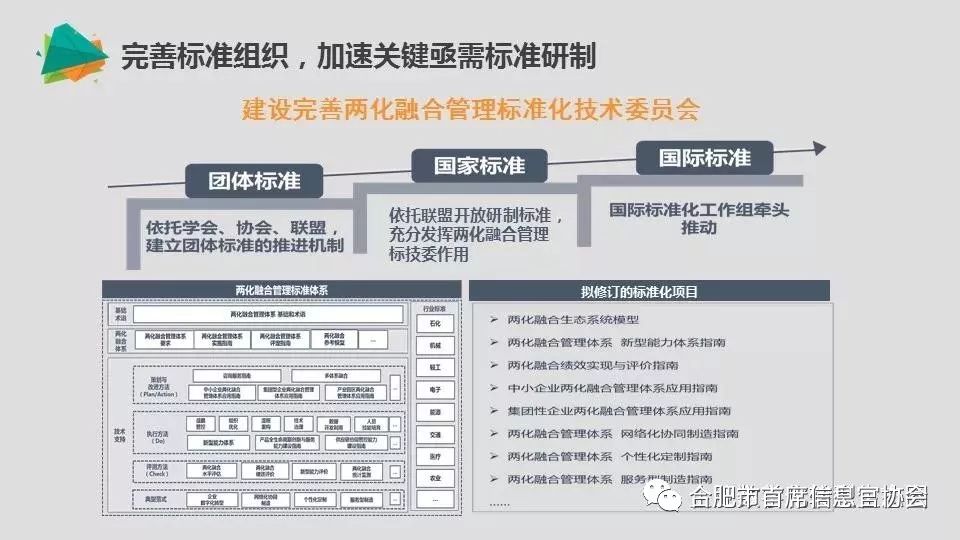国家标准:依托联盟开放研制标准,充分发挥两化融合管理标技委作用。