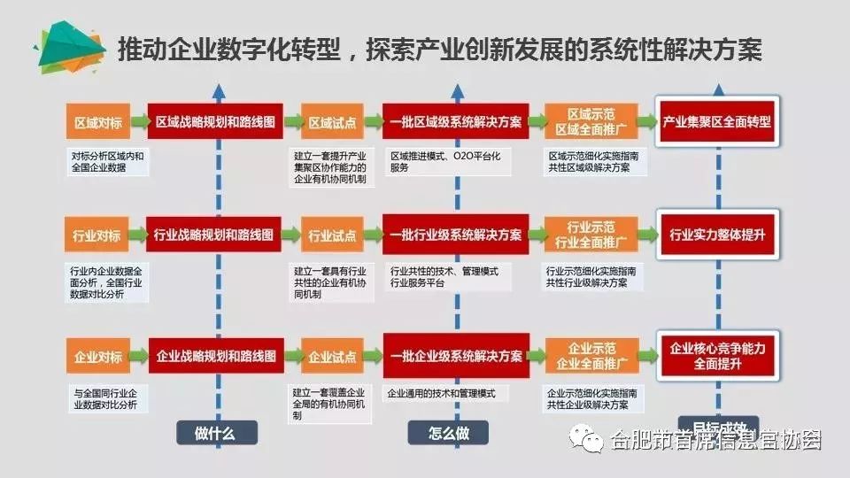 从企业、行业、区域不同层面,开展评估对标、战略规划和路线图、试点、系统解决方案研制、示范、全面推广等工作,促进企业核心竞争力全面提升、行业实力整体提升、产业集聚区全面转型。