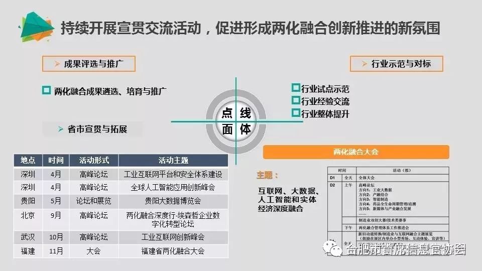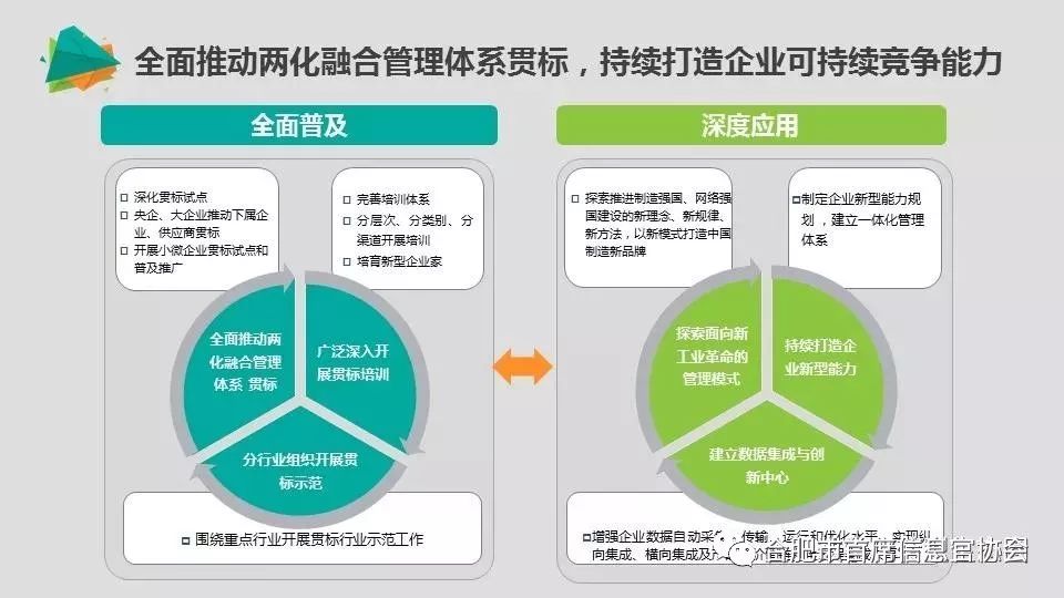 全面普及:全面推动两化融合管理体系贯标、广泛深入开展贯标培训、分行业组织开展贯标示范。