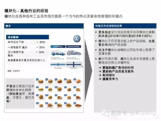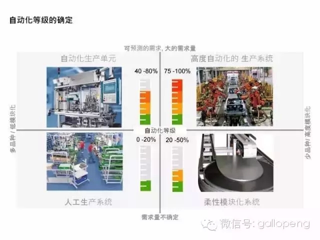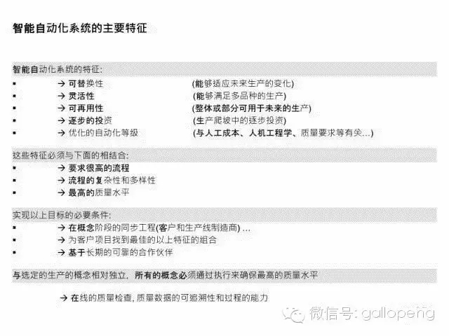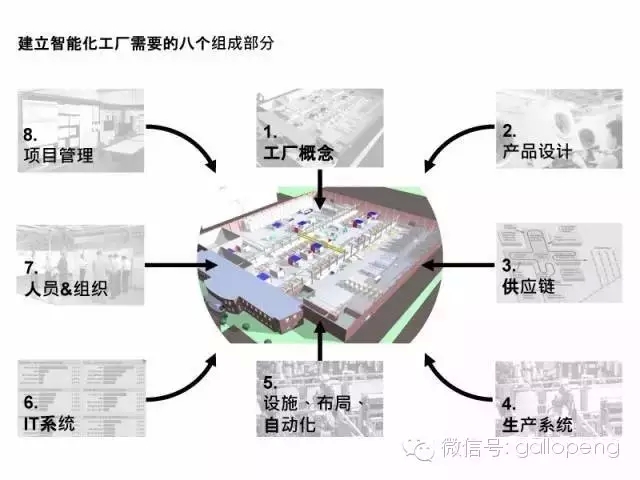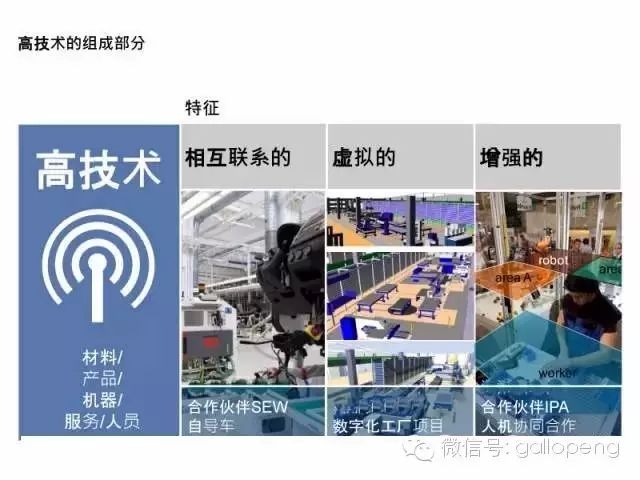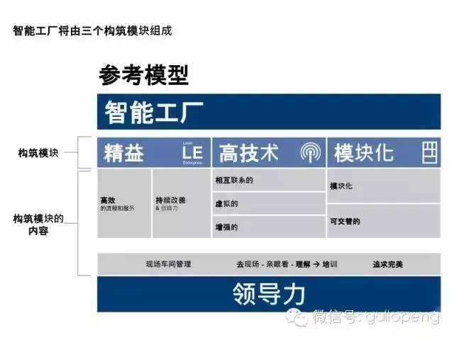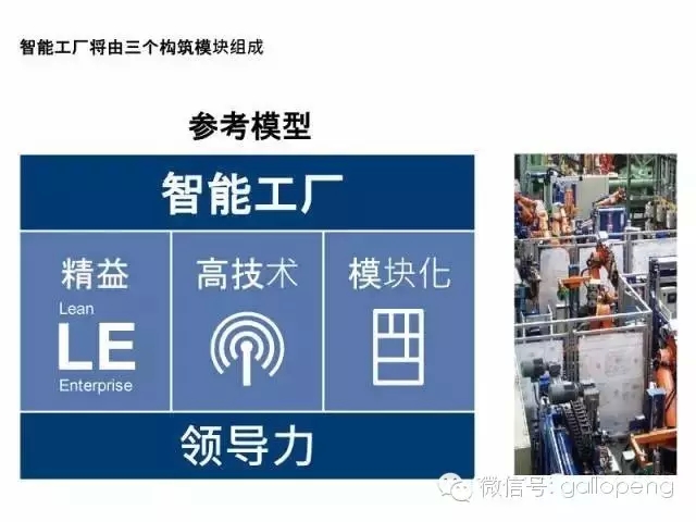 智能工厂将有三个构筑模块组成:精益、高技术和模块化。精益(LE)方面高效的流程与服务、持续改善的创造力;高技术方面包括:相互联系的、虚拟的和增强的;模块化包括模块化与可交替的。