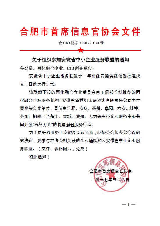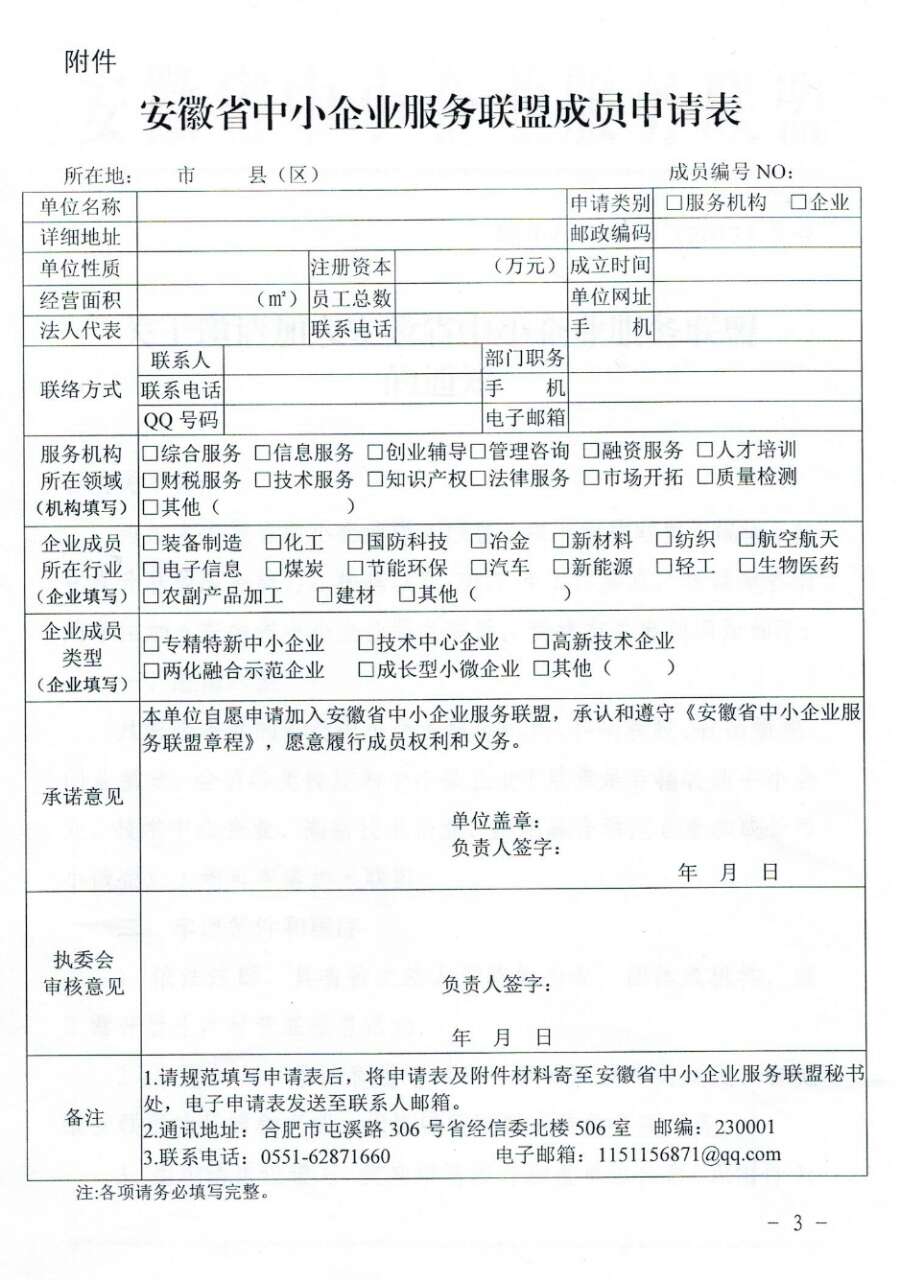为了更好的服务于安徽及周边企业,经协会会长办公会议研究决定:要求与本协会相关联的企业踊跃加入安徽省中小企业服务联盟。(文件、表格附后,免费)