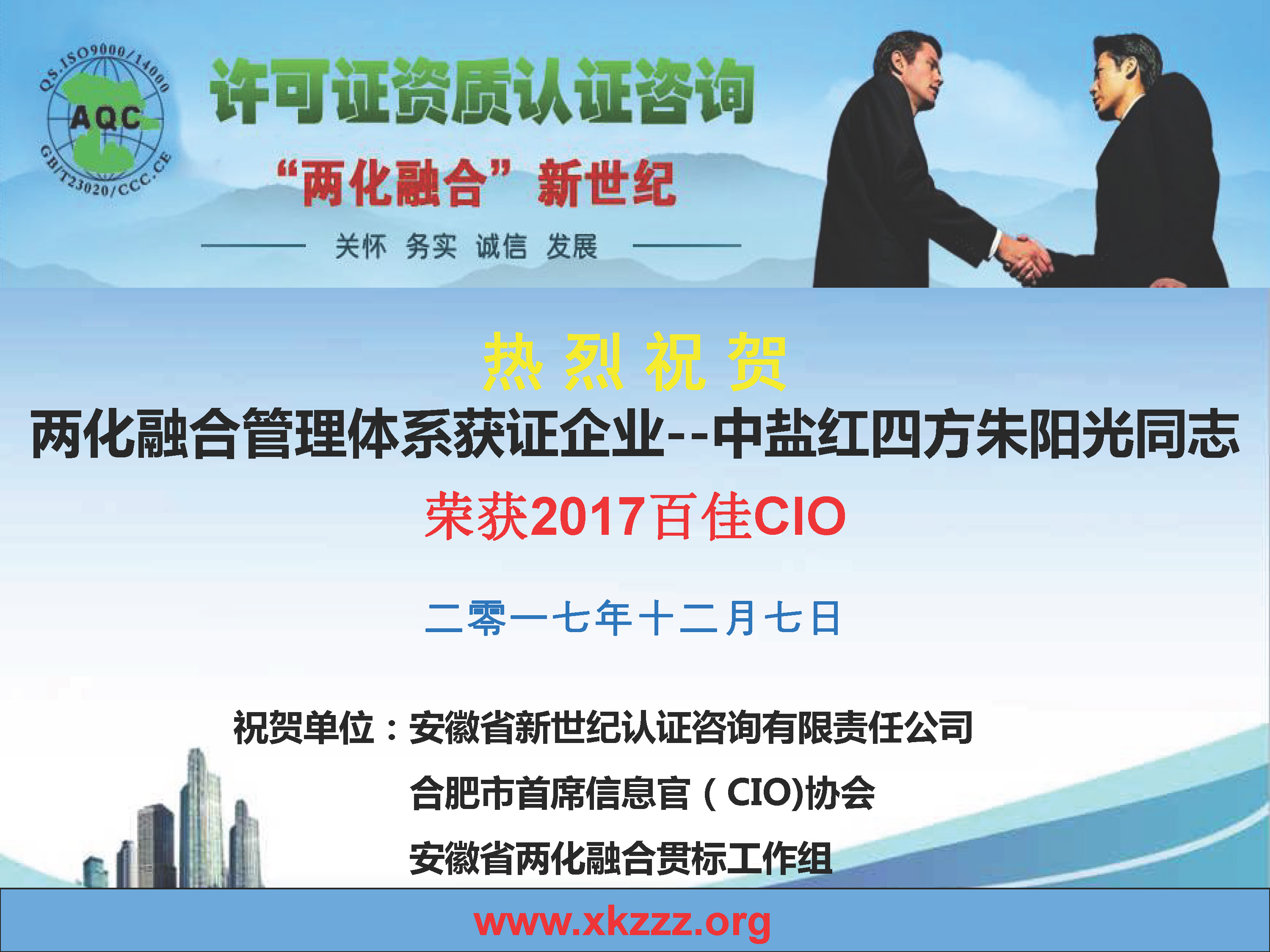 【安徽CIO联盟】祝贺中盐红四方朱阳光同志荣获2017百佳CIO