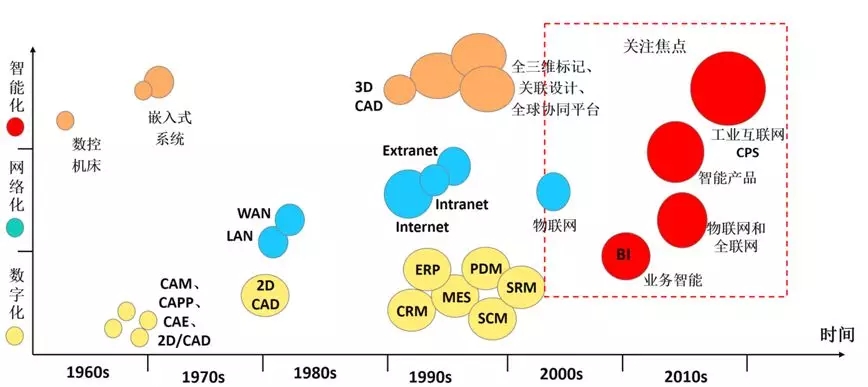 企业智能化的发展,可以回溯到上个世纪六十年代初。通过图2的制造业智能化发展,可以看到制造业如何从数字化走到网络化,再走到智能化。