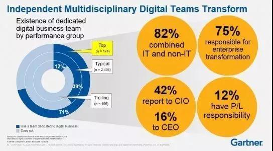 领先的企业中,71%设立了这样的团队,而落后的企业中仅12%设立了这样的团队。82%的这个团队是一个由IT和非IT人员组成的混合型的团队,75%参与企业的变革,42%向CIO汇报,16%向CEO汇报,12%具有盈利的职责。