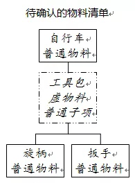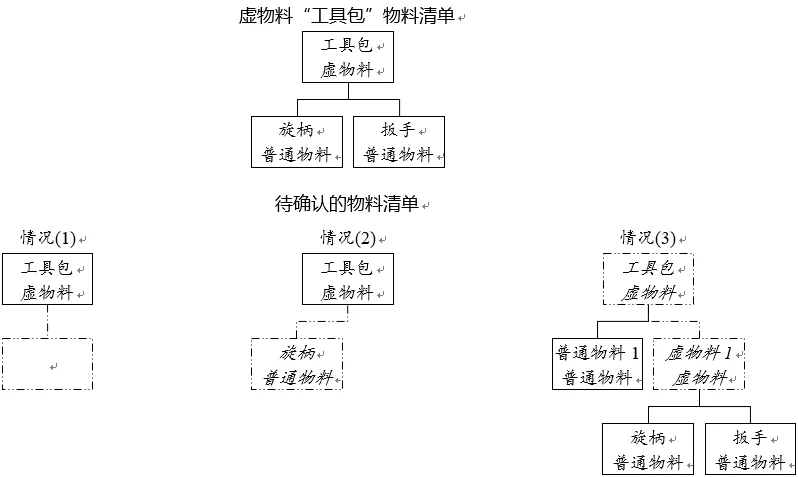 物料B作为父项时,尽管不要求虚物料有完全的物料清单,但物料B应至少有2个子项。以父项为“工具包”的单层物料清单为例,说明对物料B的物料清单需要提示物料管理员确认的几种情况。