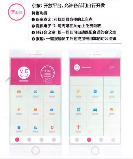 那就自己开发吧!ME的一大特点是它是一个开放平台,允许各个部门在这个平台上开发、增添自己需要的功能——当然也只有技术公司能这么玩。于是,用户体验部开发了一个可以横向比较京东App客户满意度的功能,它可以按周统计用户的评价并反馈到体验部;营销部的人开发了一个“京东罗盘”,这样他们就能每周检测不同产品的销量和价格。“日前ME上自主开发的功能有近20个。”移动办公团队产品经理李卓说。