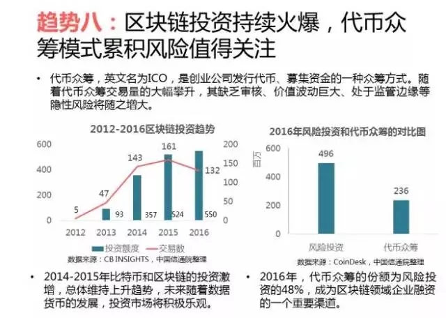 区块链成为资本市场追逐的热点。未来投资还将延续2014-2016年不断上升的趋势。与其他科技领域的融资模式不同,区块链领域出现了一种称为“代币众筹”的模式,即Initial Coin Offering(ICO),是创业公司发行代币、募集资金的一种众筹方式。2016年,全球代币众筹的份额已占区块链相关风险投资总额的48%,成为一个重要渠道。预计2017年还将出现200个以上的ICO案例。我们认为,随着代币众筹交易量攀升,其缺乏审核、价值波动巨大、处于监管边缘等风险将随之增大,值得关注。