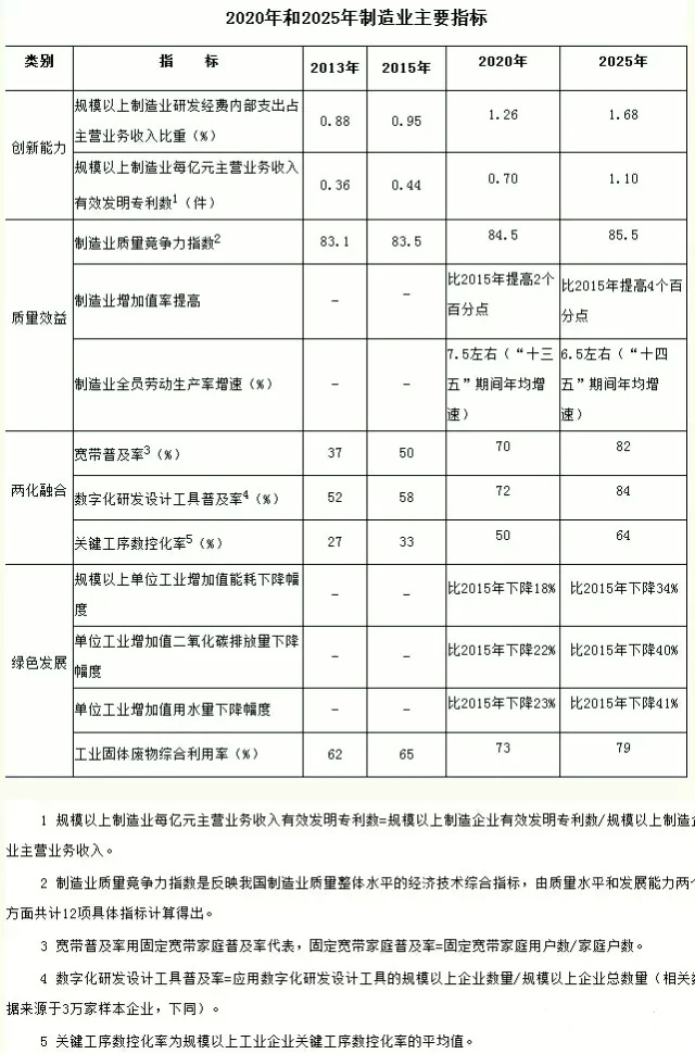到2025年,制造业整体素质大幅提升,创新能力显著增强,全员劳动生产率明显提高,两化(工业化和信息化)融合迈上新台阶。重点行业单位工业增加值能耗、物耗及污染物排放达到世界先进水平。形成一批具有较强国际竞争力的跨国公司和产业集群,在全球产业分工和价值链中的地位明显提升。