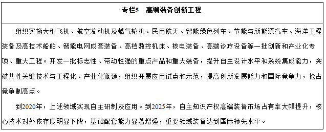 航空装备。加快大型飞机研制,适时启动宽体客机研制,鼓励国际合作研制重型直升机;推进干支线飞机、直升机、无人机和通用飞机产业化。突破高推重比、先进涡桨(轴)发动机及大涵道比涡扇发动机技术,建立发动机自主发展工业体系。开发先进机载设备及系统,形成自主完整的航空产业链。